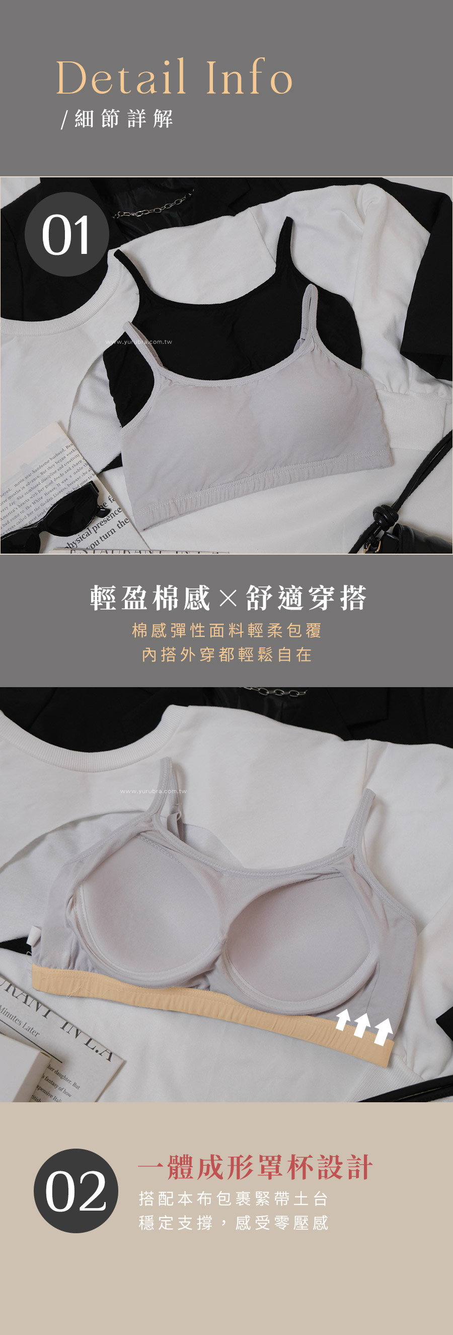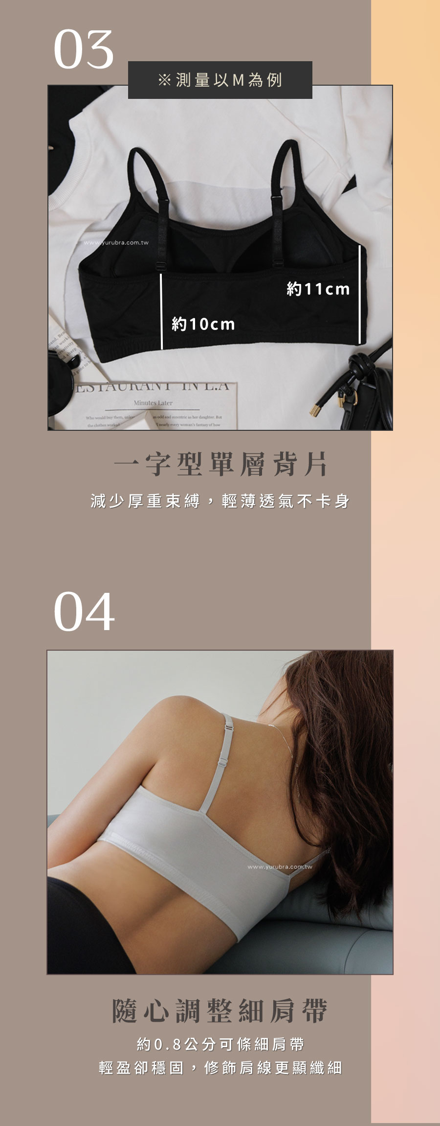 ★含涼爽紗的表布延伸至背部,360度舒適全守護~ ★細肩帶設計,讓穿搭衣著更自由 ★固定式杯模,內裡親膚混棉布,胸型不易亂跑位 ★半圓無鋼圈帶,自然貼合、溫柔呈托胸下肉肉 ★背心式設計,胸前完整包覆,任何場合都實穿 ★一字型無背扣設計,俐落、清爽、好穿搭! ★高彈力鬆緊土台,好穿不易勒,不限場合穩住下圍 ★台灣製造,品質保證