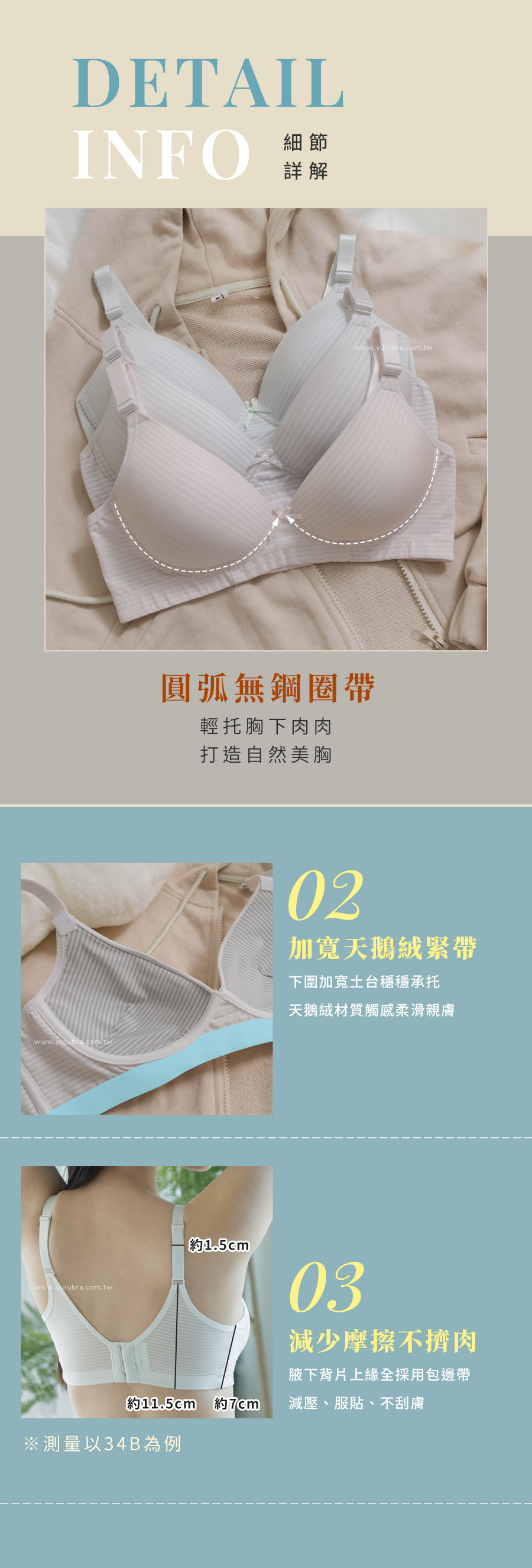 ★超消暑冰透光色系,低彩度冷色調,就像為美胸提亮打光 ★無痕表布×自然立體杯,輕盈不留痕,夏日輕盈必備款! ★罩杯裡外全採高規格細緻布,觸感滑順、涼爽不悶熱 ★下圍土台採親膚天鵝絨緊帶、加寬穩定不壓迫 ★杯模輕柔有彈性,配合胸型自然服貼不簍空 ★肩帶加寬至1.5公分,適當減壓又輕盈 ★小U型包邊背片,輕薄透氣,背部也好舒適 ★三排三扣,穿著穩定 ★台灣製造,品質保證