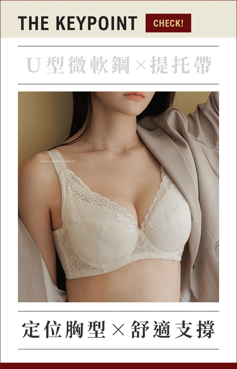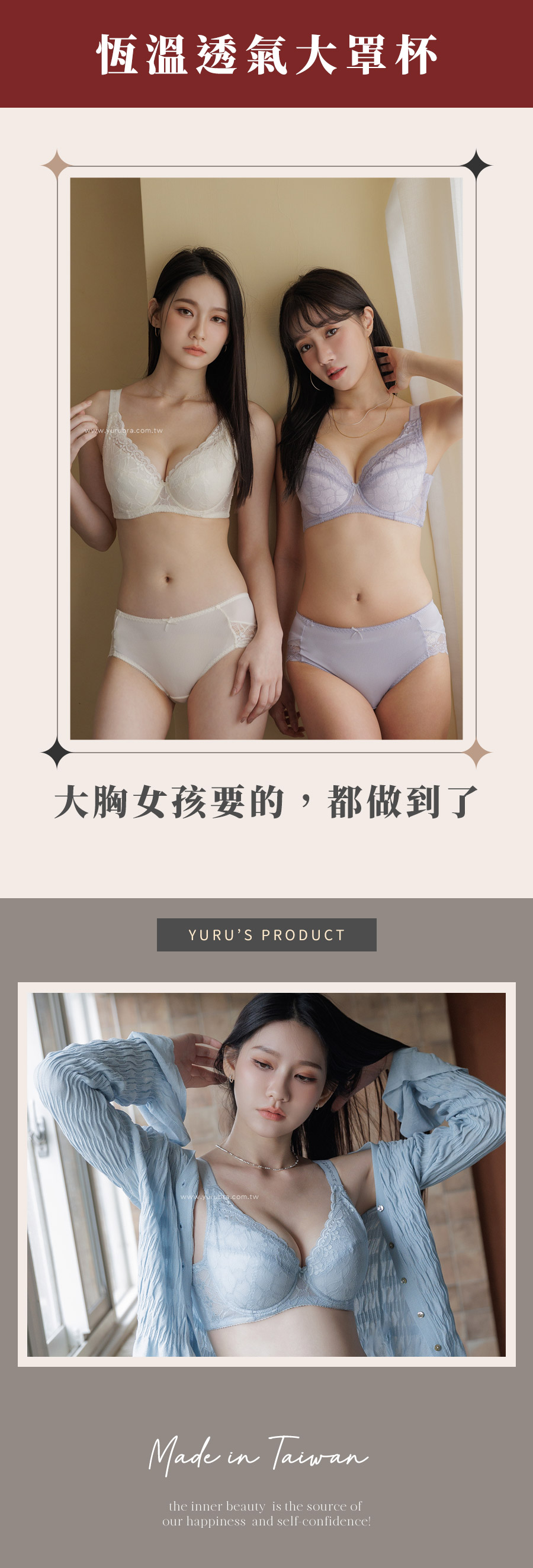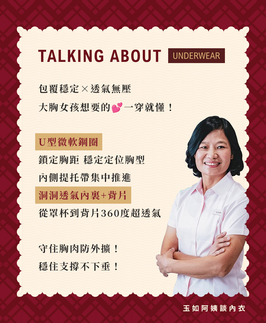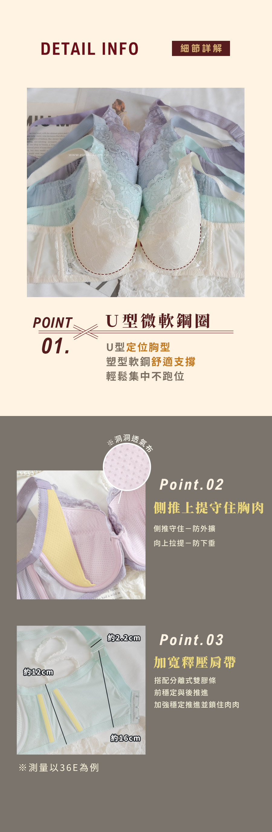 ★大罩杯全面再舒適!透氣親膚~ ★色調柔和清晰,如在清晨的露臺,陽光灑在蕾絲上的通透感 ★4/5罩+C型軟鋼圈,包覆托高防下垂,舒適打造美胸 ★內裡洞洞涼感透氣布料,讓你的胸部如徜徉在雲上~ ★無彈棉內提托片連接肩帶,胸型上提又集中 ★加寬約2.3CM肩帶,不只分散肩膀壓力更能加強拉提力道 ★分離式雙膠條設計,前穩定後推進,側邊曲線更美麗 ★外層塑網布×內層透氣涼爽布,穩定之餘更添一分清盈涼爽 ★台灣製造,品質保證