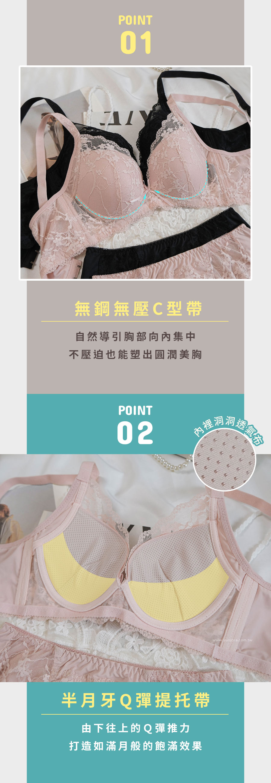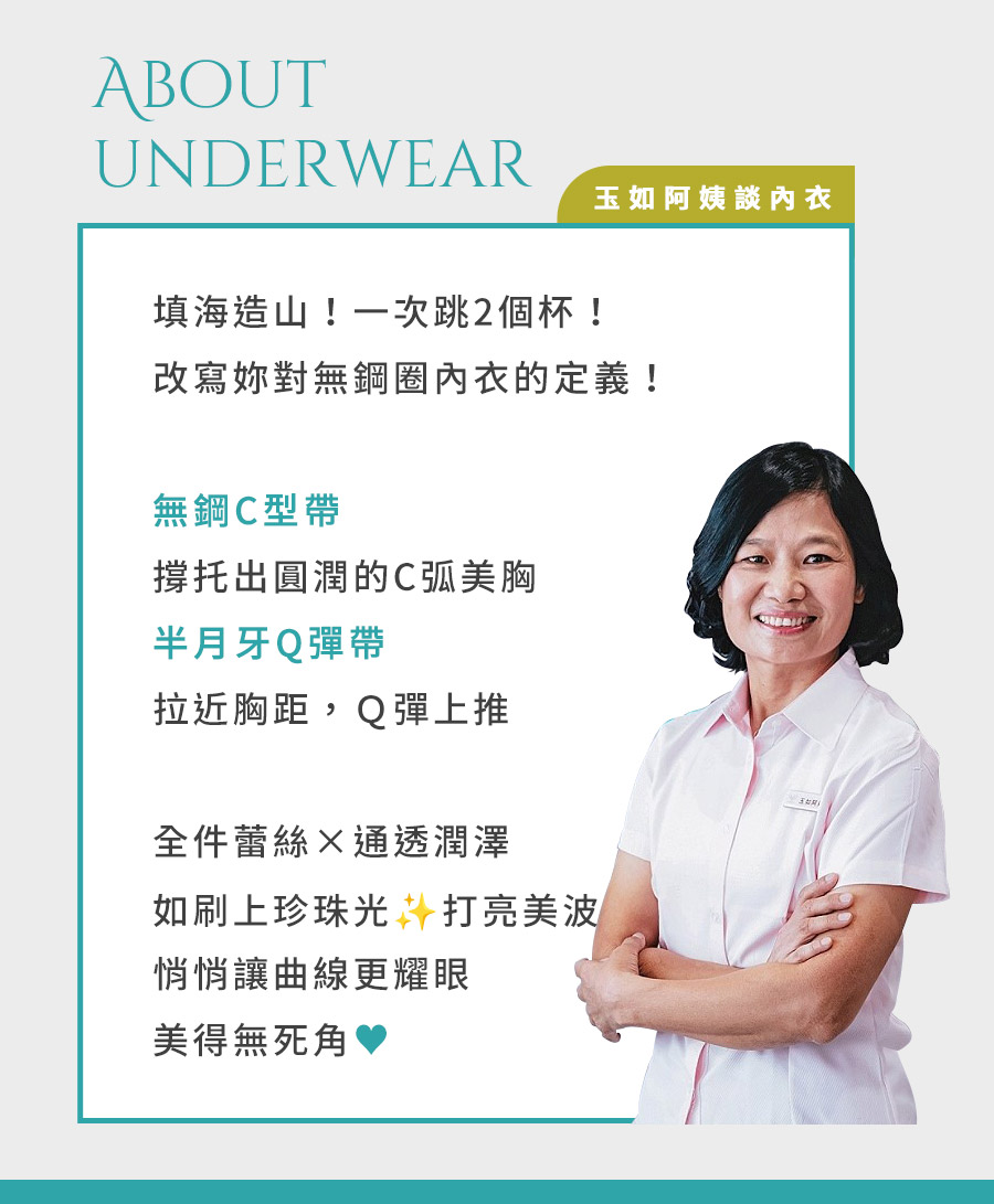 ★填海造山~視覺升級,瞬間飽滿 ★光感蕾絲輕覆上胸,增添如珍珠般溫潤光澤 ★零束縛無鋼圈,舒適無壓,C弧塑造圓挺美胸 ★半月牙Q彈帶,拉近胸距,穩固上托 ★杯內Q彈洞洞布料,親膚透氣不悶熱 ★雙層背片,撫平並修飾背部曲線 ★副乳側壓片,側收穩固副乳肉肉 ★低脊心水滴型挺立杯,無鋼圈也能穿出性感奇蹟 ★台灣製造,品質保證