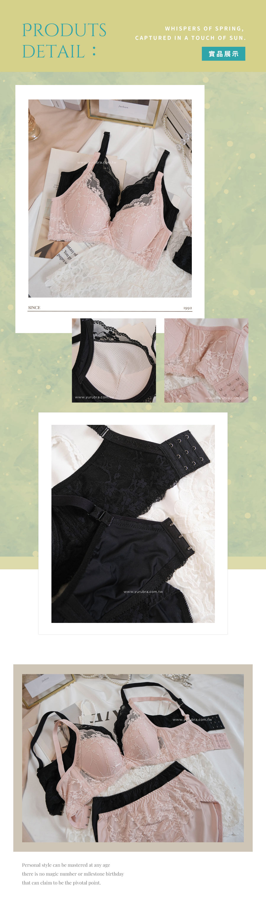 蕾絲:尼龍81%,彈性纖維19% 杯裡:尼龍90%,彈性纖維10% 背片:尼龍90%,彈性纖維10%
