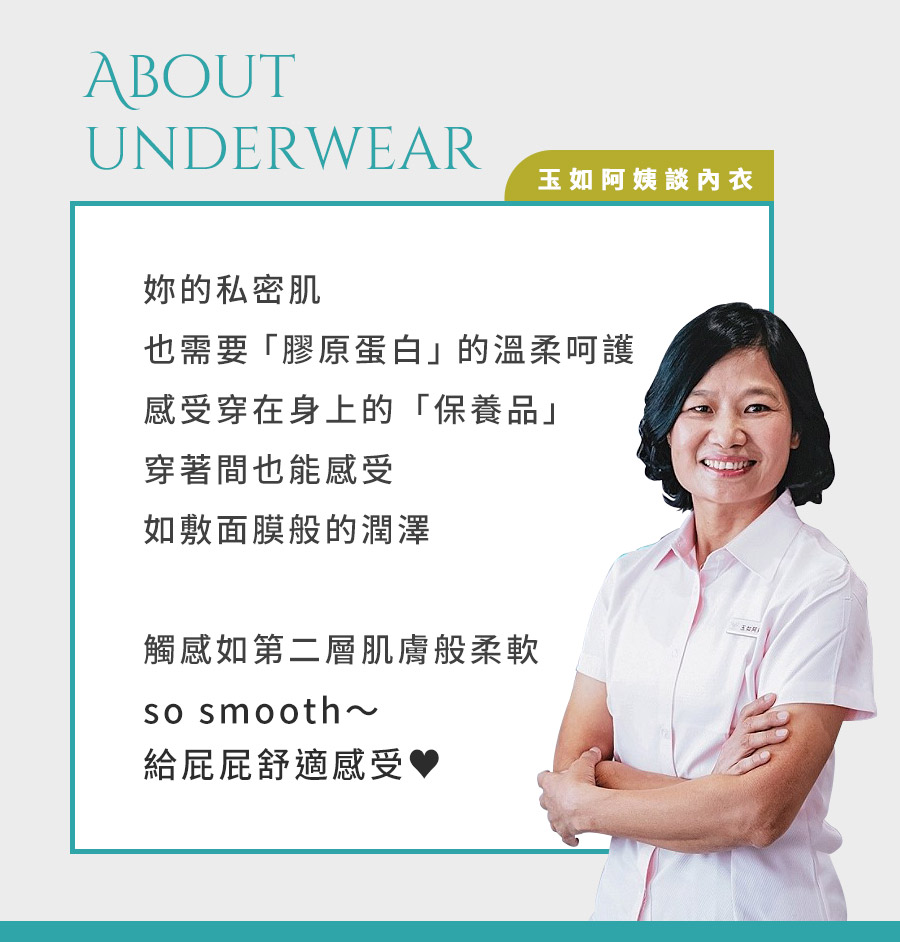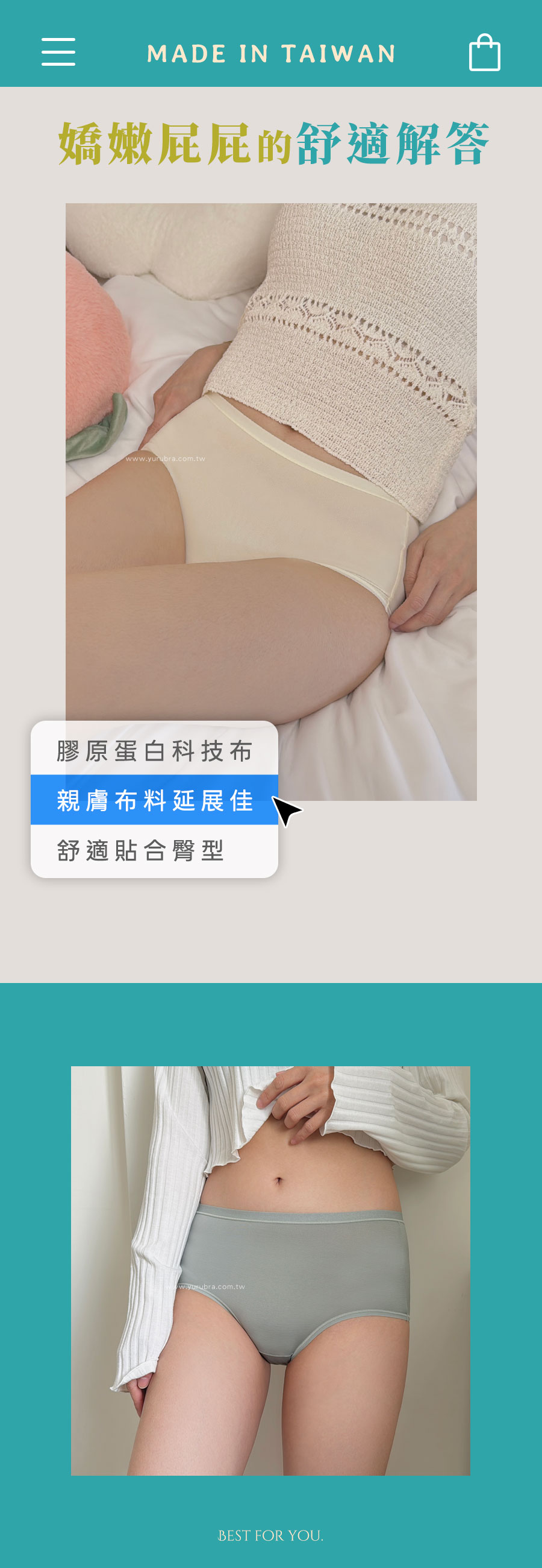 ★膠原蛋白科技纖維,輕柔呵護嬌嫩肌膚 ★頂級面料製成的柔細觸感,活動無負擔 ★超親膚布料,溫柔包覆屁屁~ ★布料延展性佳,舒適貼合臀型 ★台灣製造,品質保證