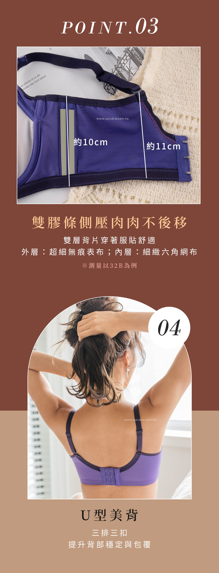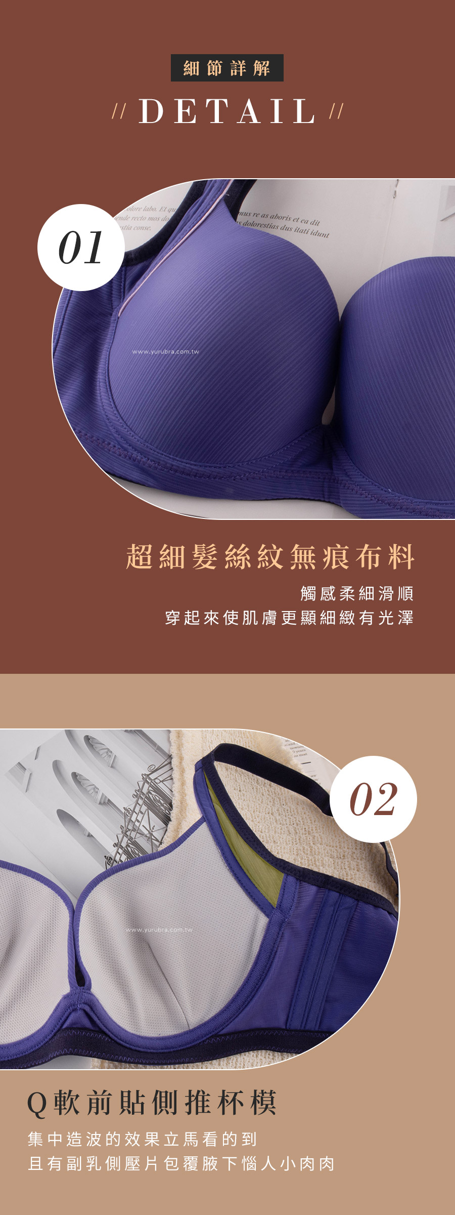 ★杯型穿起來集中包覆,胸前貼合度好,不容易簍空喔 ★表布無痕超細髮絲紋布料,方便搭配衣著 ★觸感柔細滑順,穿起來使肌膚更顯細緻有光澤 ★Q軟前貼側推杯模,集中造波的效果立馬看的到 ★低脊心舒適不壓胸骨,好穿又能露出性感的溝溝喔 ★在簡單與俐落的外型下,有副乳側壓片包覆腋下惱人小肉肉 ★雙膠條側壓包覆,穩定撫平肉肉不往後移 ★雙層背片穿著服貼舒適,讓討厭束縛感的妳也會愛上 ★U型美背與三排扣,讓身形顯瘦又完美 ★台灣製造,品質保證