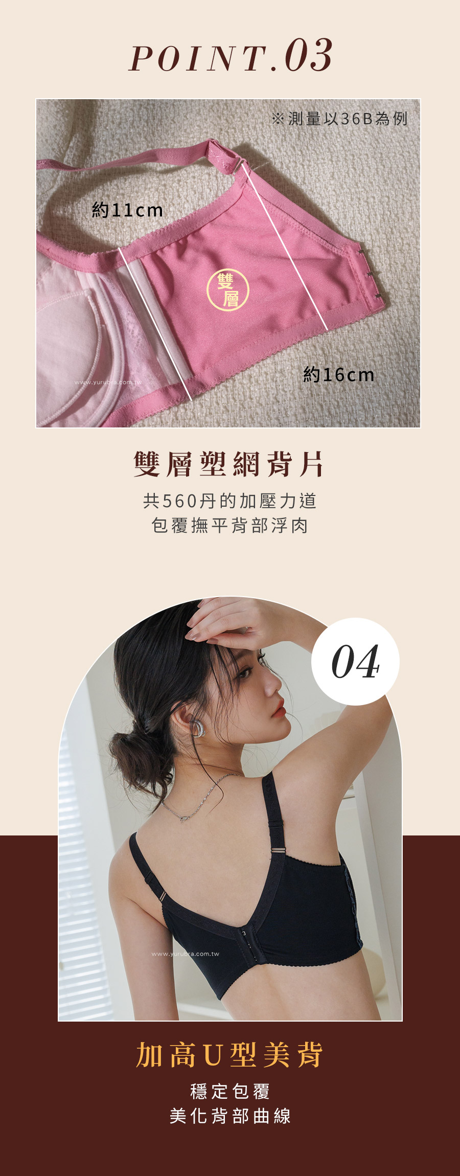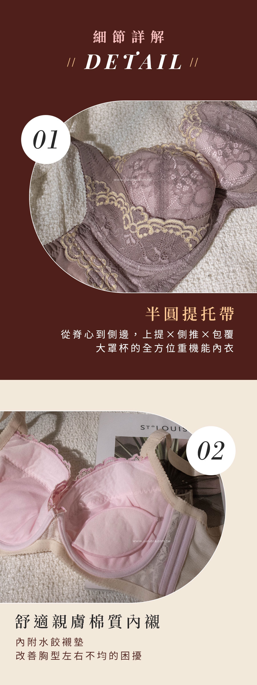 ★3/4+罩杯,包覆力UP UP! ★唯美蕾絲曲線交織,更顯深邃胸型 ★重機能半圓形提托,強力托高UP! ★內裏絲棉,黃金角度杯模剪裁,溫和包覆並上托胸肉 ★雙膠條設計,穩定鎖住側浮肉 ★內附可拆卸水餃墊,輕鬆調整大小胸 ★加高U型美背,穩定不易移位 ★三排扣設計,既穩固又好穿脫 ★台灣製造,品質保證