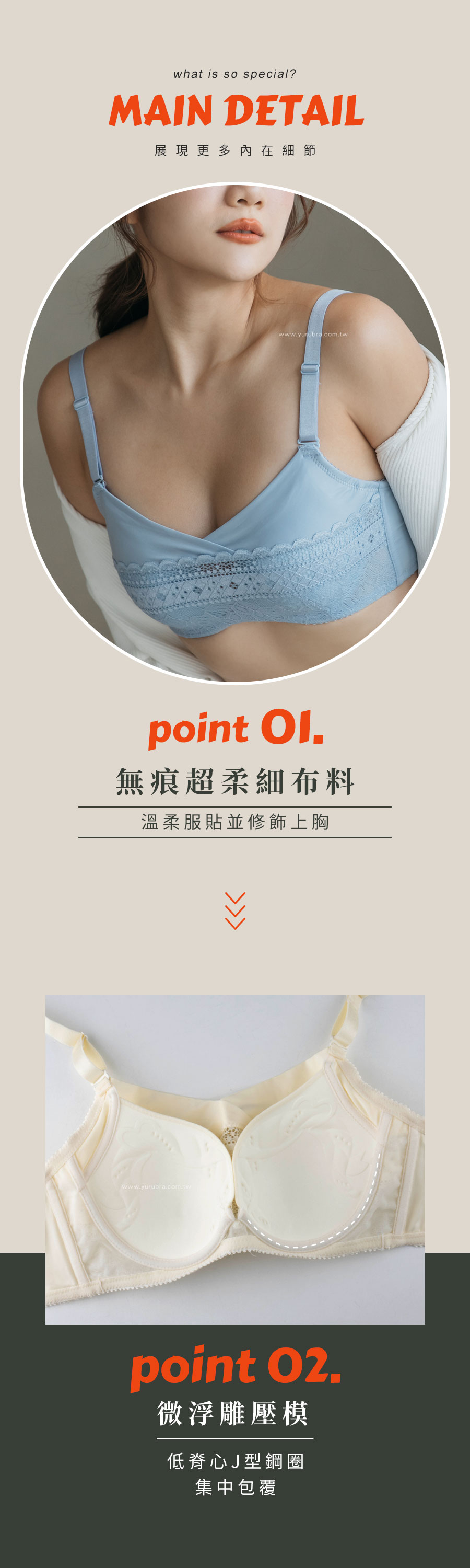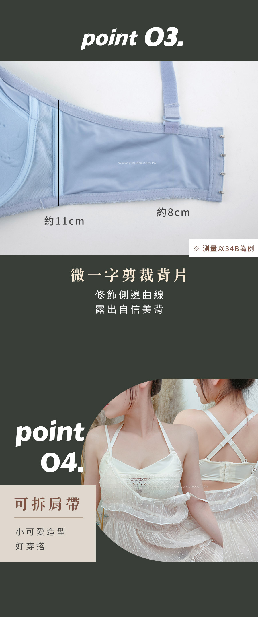 ★穩定不走山,集中再托高!柔美舒適的小可愛型穿搭款♥ ★無痕超柔細布料,交叉於胸上緣,溫柔服貼與修飾上胸 ★杯模內裡微浮雕壓模,讓胸上緣更貼合 ★可拆式肩帶,繞頸、後背交叉隨興穿搭 ★低脊心J型鋼圈,集中包覆 ★隱藏式副乳側壓片,低調的修飾腋下肉肉 ★背片微一字剪裁,修飾側邊曲線,露出自信美背♥ ★採用三排四扣,穿搭之餘更穩定安心 ★台灣製造,品質保證