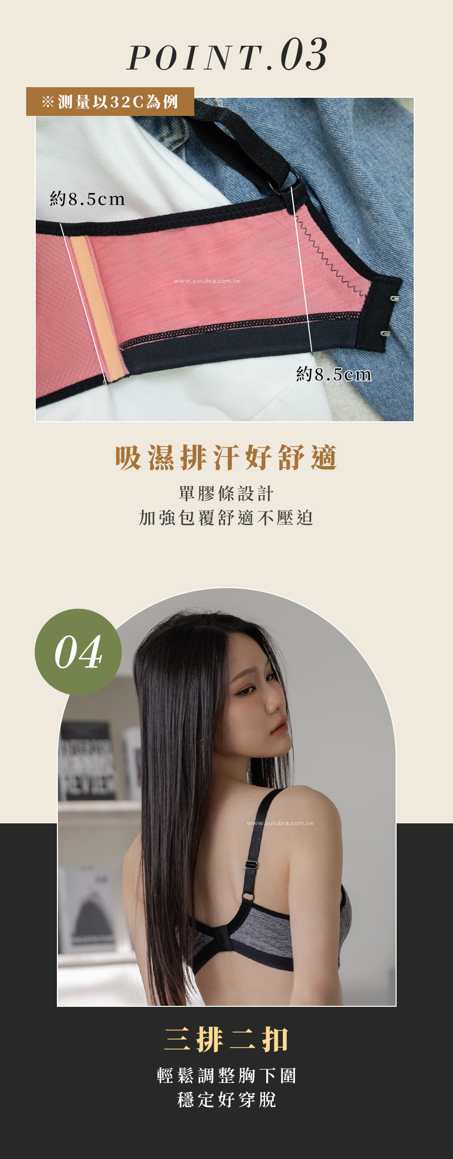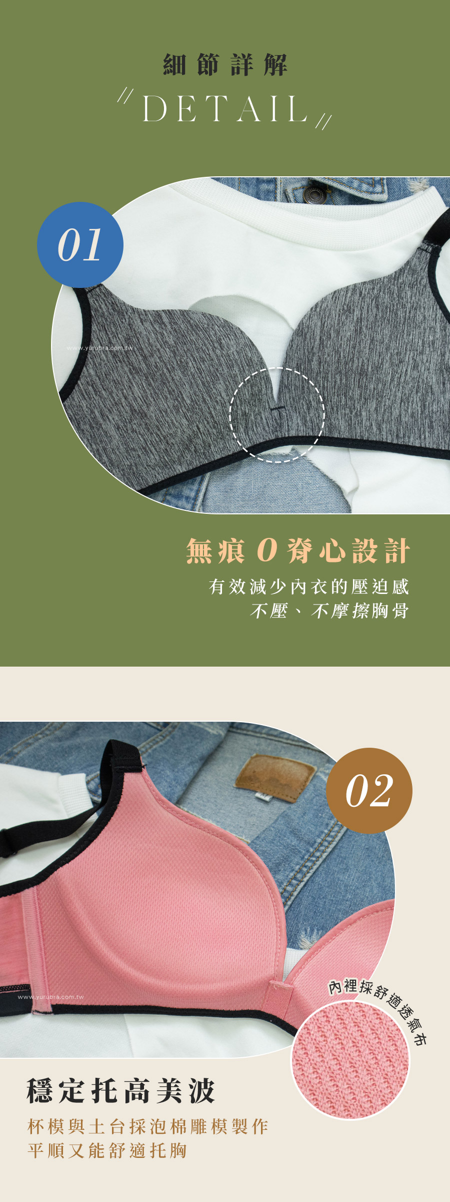 ★B罩杯:桃心設計下厚襯墊,胸部絕對UP!UP!有感 ★C罩杯:下厚上薄襯墊,飽滿之餘不易壓胸 ★無鋼圈杯模,無痕的布料,絕對是追求舒適的女孩必敗品! ★杯模內裡洞洞透氣布料,更加透氣不易悶熱 ★零脊心設計,對雞胸女孩非常友善喲 ★側邊單膠條,穩定側胸集中 ★單層背片,輕盈修飾背部曲線 ★U型美背設計,活動無拘束 ★3排2扣設計,輕巧好穿脫 ★台灣製造,品質保證