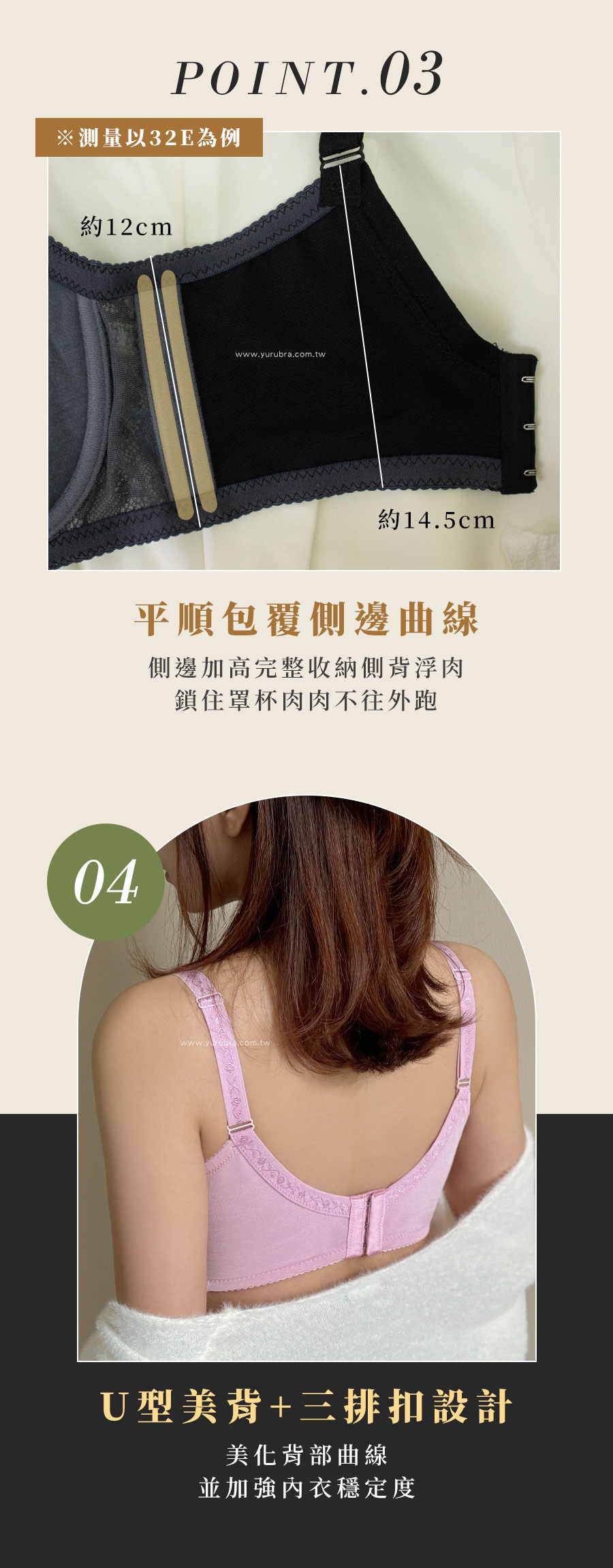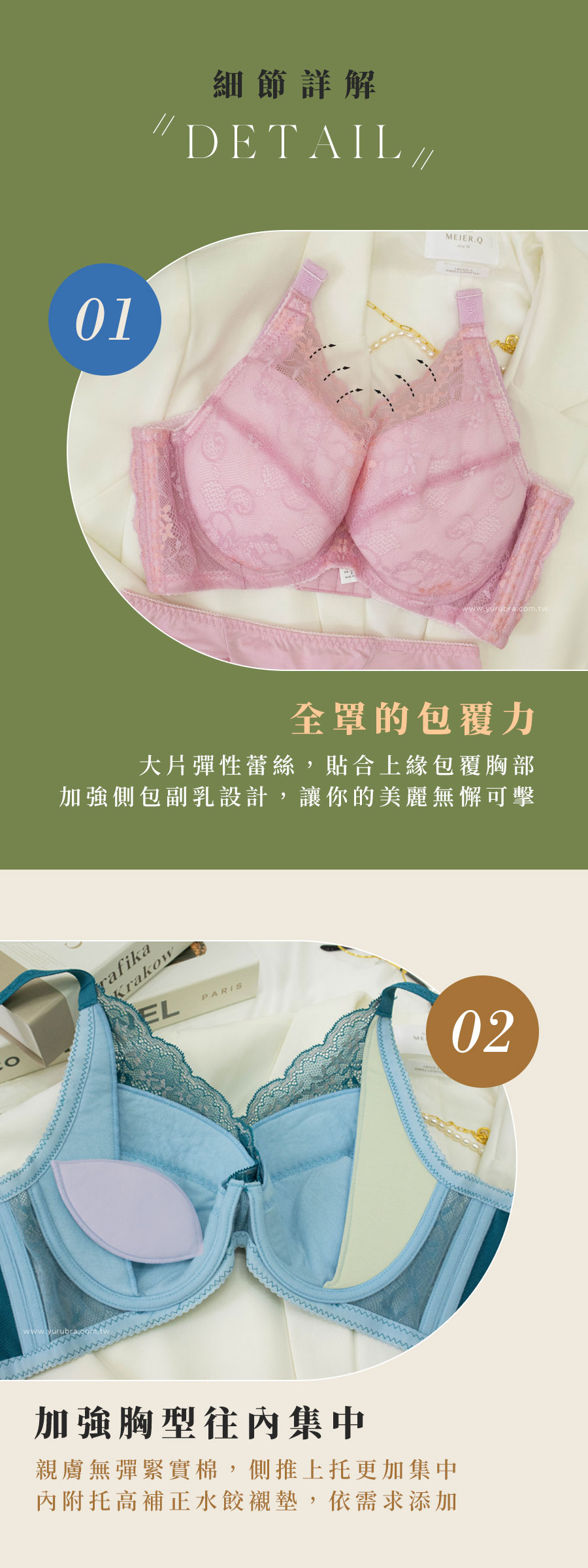★近乎全罩的包覆力,彈性蕾絲能穩穩貼合胸部上緣 ★J型鋼圈V剪裁,釋放胸骨壓力 ★抵抗地心引力,讓胸部挺起來!展現托高渾圓美胸 ★加強側包副乳設計,讓胸部超集中! ★親膚無彈性緊實棉打造隱藏內提托片,加強胸型往內集中的力量 ★側邊加高完整收納側背浮肉,鎖住罩杯肉肉不往外跑 ★U型美背搭配三排三扣,穿著美麗又穩定 ★台灣製造,品質保證