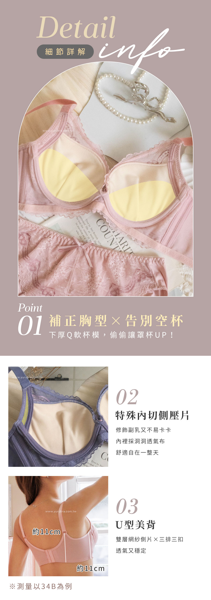 ★增量!小胸升級必選! ★杯模及上緣蕾絲內貼,貼合上胸,不易簍空 ★如緞帶般繫在胸前的蕾絲,典雅可愛! ★超軟L型鋼圈,不易壓迫、輕鬆集中! ★機能側包片,輕鬆修飾及包覆副乳 ★B罩下厚可上推胸肉,視覺飽滿,激升罩杯upup! ★側邊雙膠條增加胸部的穩定性,將胸肉鎖定至罩杯內 ★U型蕾絲美背,背片加高提升包覆面積 ★搭配三排三扣,穿著舒適又穩定 ★台灣製造,品質保證