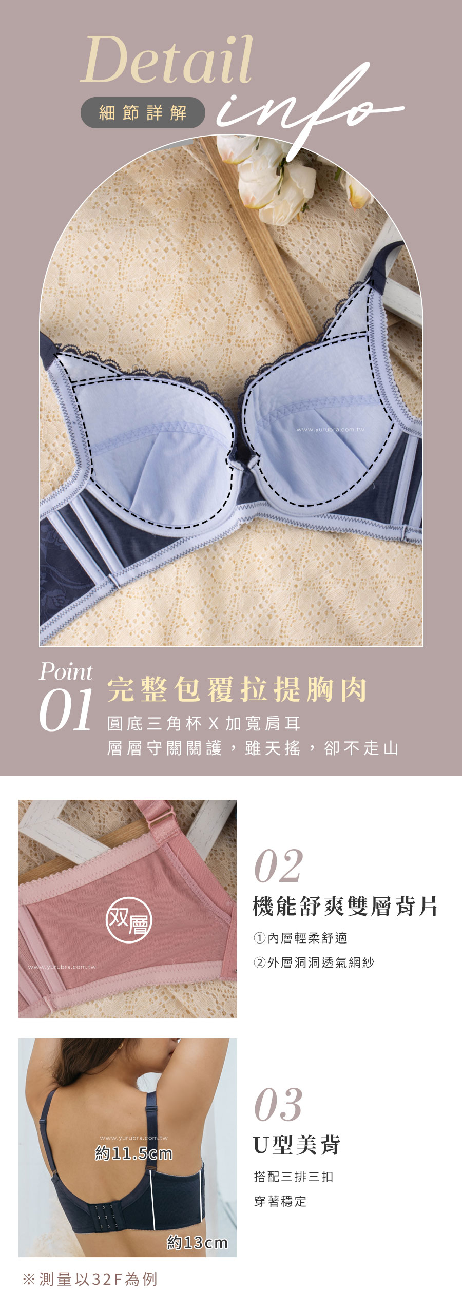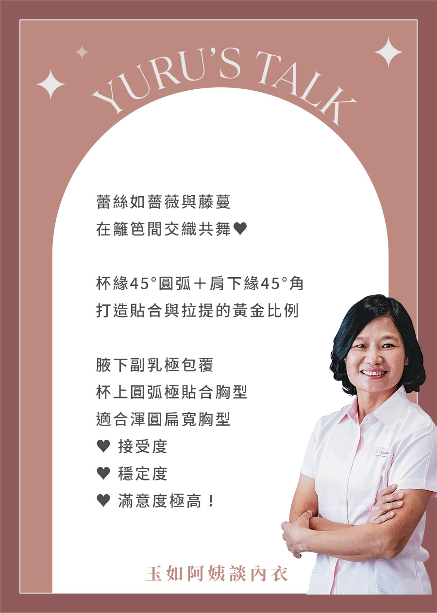 ★蕾絲如薔薇與藤蔓在籬笆間交織共舞! ★極適合渾圓扁寬胸型,接受度.穩定度.滿意度極高! ★雙45°剪裁!為經典再創高峰! ★杯緣45°圓弧+肩下緣45°角,黃間比例的剪裁,完整貼合與拉提 ★3/4~4/5圓弧杯,加寬肩耳,層層守關觀護,雖天搖,卻不走山 ★腋下花邊設計,烘托出舞動的薔薇,讓美麗零死角 ★雙層背片,內輕柔,外洞洞透氣網紗,舒爽與機能一次擁有 ★分離式雙膠條,穩定側邊同時守住肉肉不位移 ★U型美背搭配三排三扣,穿著穩定 ★台灣製造,品質保證