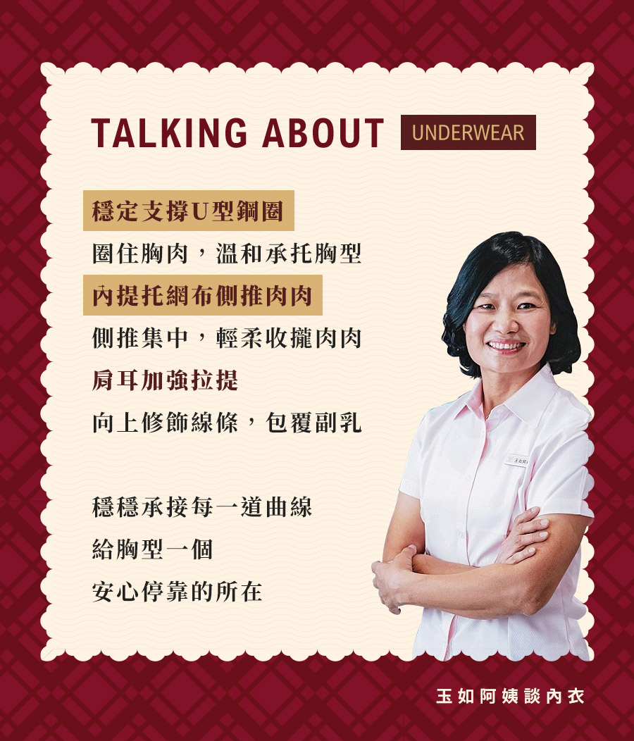蕾絲:彈性纖維19.7%,尼龍72.7%,聚酯纖維7.6% 側翼面:彈性纖維30%,尼龍70% 側翼裡:彈性纖維21%,尼龍27%,尼龍(涼爽紗)52% 杯裡:聚酯纖維65%,棉35%