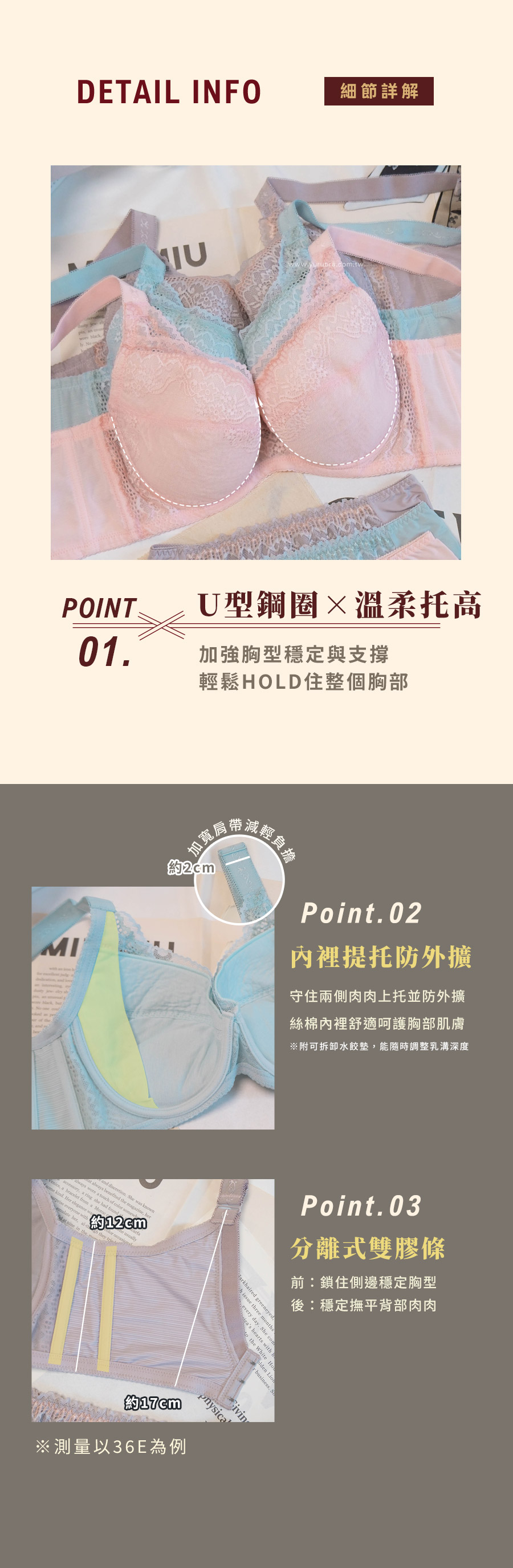 ★側推上托經典剪裁,內聚提托力更升級 ★4/5罩的包覆度,大罩杯水水穿著也安心 ★加寬的上片及蕾絲,對上胸的包覆度更提升 ★無彈透氣內提托摺網布,集中防外擴肉肉不悶熱 ★肩帶加寬至1.8CM,面積加大肩膀釋壓更分散 ★分離式雙膠條設計,第一線鎮壓鎖定、第二線穩定推進 ★背片內層涼爽紗、外層塑身網布,舒適與機能全守住 ★加高背片搭配三排三扣,穩定包覆背部更全面 ★台灣製造,品質保證 | ||