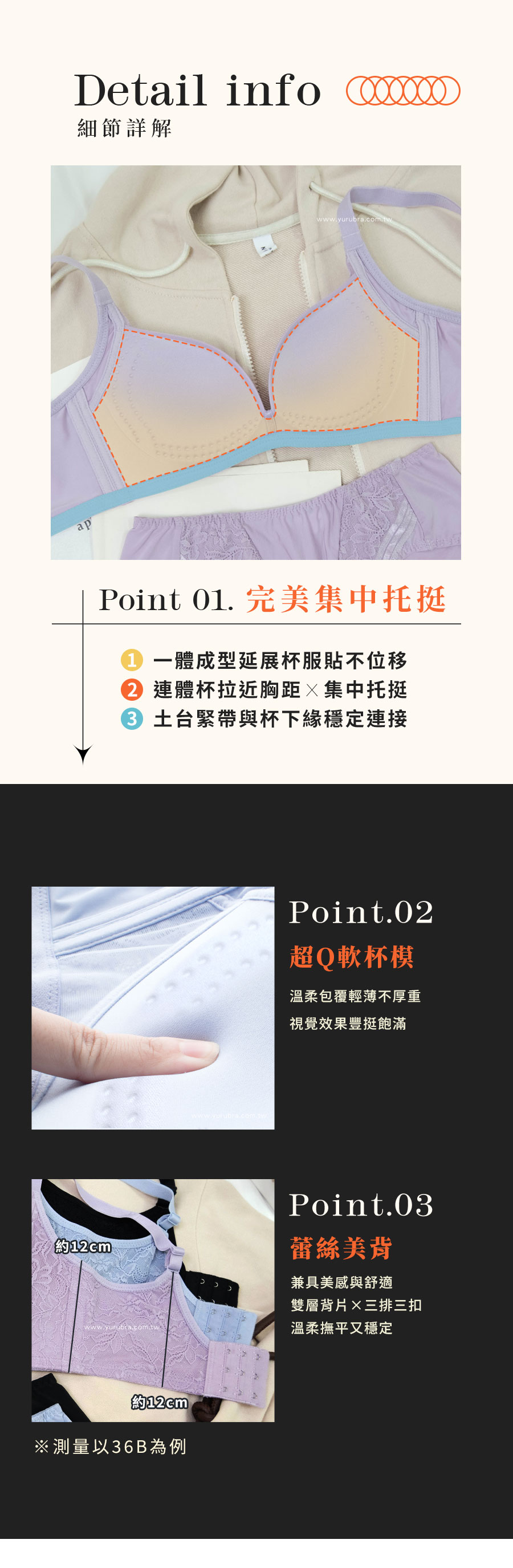 ★一體成型Q軟杯模,服貼胸部上緣 ★服貼兩側的密緻蕾絲,收攏曲線,讓胸型視覺更立體 ★低脊心設計,雞胸或胸骨較凸的女孩,都驚嘆好舒服~ ★漸進式下厚上薄設計,減少簍空超飽滿!! ★副乳側壓片,向上延伸更修飾 ★雙層超細U型背片,撫平肉肉兼具舒適感 ★腋下雙併膠條,穩定側邊不走位 ★U型美背+三排三扣設計,穩定並修飾後背肉肉 ★台灣製造,品質保證