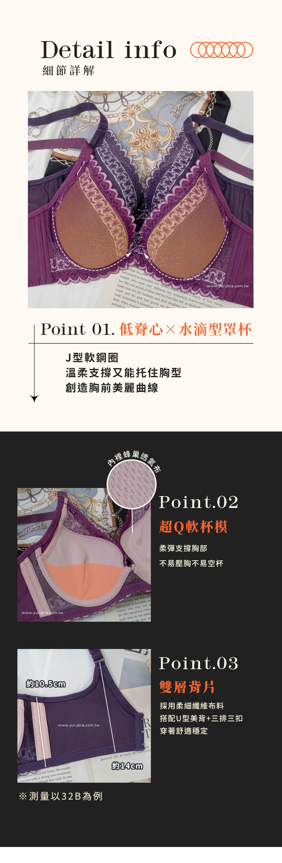 ★低脊心×水滴型罩杯,創造胸前美麗曲線 ★心型蕾絲布料滾邊,搭上低調內斂的色系,讓每個女孩都能輕鬆駕馭♡ ★J型軟鋼圈,溫柔支撐又能托住胸型 ★超Q軟杯模,給ㄋㄟ ㄋㄟ最溫柔的包覆 ★內裡透氣網眼布,穿著舒適不易悶熱 ★副乳側壓片,為柔細纖維布料,腋下不易卡卡 ★側邊雙膠條撫平側肉,外層以棉布包裹膠條更親膚 ★雙層背片設計,採用柔細纖維布料,讓穿著內衣成為享受 ★U型美背加上三排扣 穿著舒適穩定 ★台灣製造,品質保證