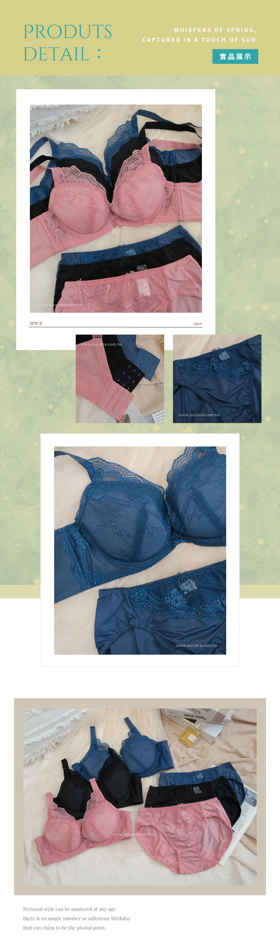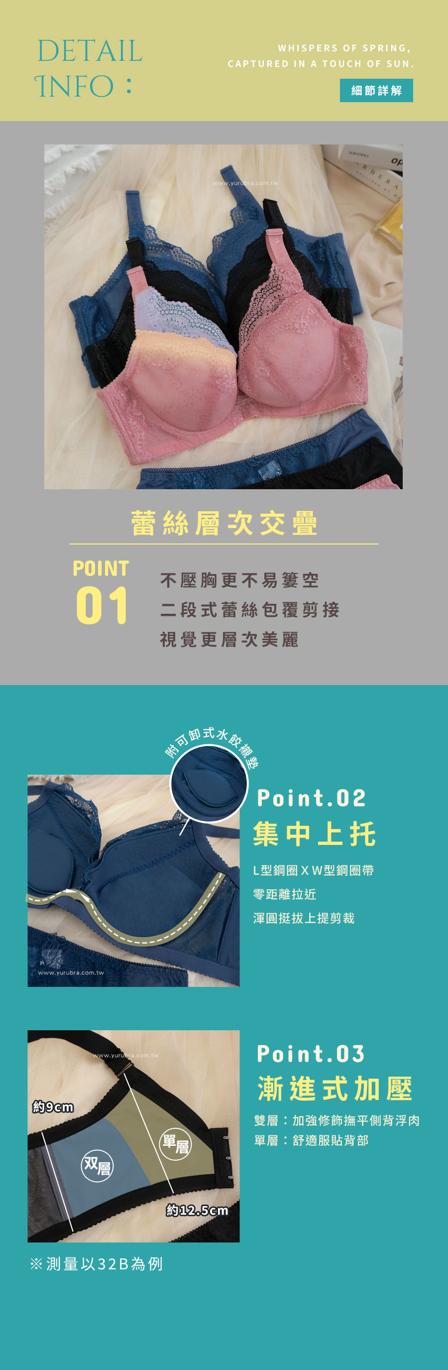 ★性感舒適/集中上托/包覆穩定,滿分內衣妳們想要的它都辦到了 ★零脊心深邃設計,蕾絲層次交疊,呈現最美的自己 ★二段式蕾絲剪接,不但包覆,視覺層次美麗 ★優雅飽和色讓膚色更顯白,耐看又驚艷 ★L型鋼圈左右框住集中上托,無畏歲月的摧殘,維持美好胸型 ★W型鋼圈帶包裹L型鋼圈,烘托上推,零距離拉近 ★絲棉圓弧上提剪裁,輕柔塑型打造渾圓挺拔雙峰 ★附可拆卸水餃墊,能隨時調整乳溝深度 ★漸進式加壓包覆尷尬的背肉,讓側背曲線更加美麗 ★U型美背包覆不擠背肉 ★台灣製造,品質保證