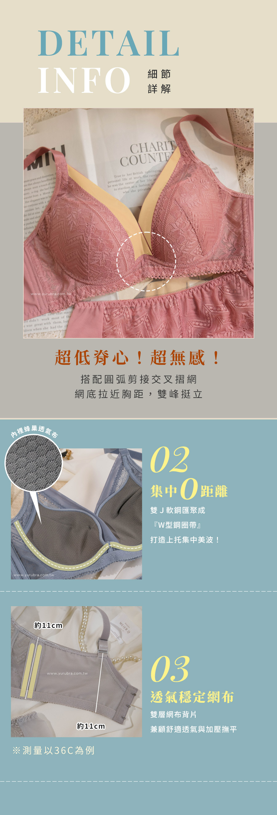 ★柔焦感絲絨色系×典雅蕾絲,增添一股神秘色彩~ ★超低脊心×V型剪裁,川流匯聚、造就無盡深谷 ★W型無鋼圈絨布條,框住集中胸肉,縮小胸距 ★雙層摺網,在脊心做交叉互拉,零距離聚攏挺立 ★側壓片與上提內聚網布做黃金三角比例銜接,打造渾圓挺立美胸 ★內裡石墨烯布料,吸濕排汗調節優異,給你最舒適的穿著體驗 ★雙層網布背片搭配三排三扣,穿著透氣更穩定 ★台灣製造,品質保證