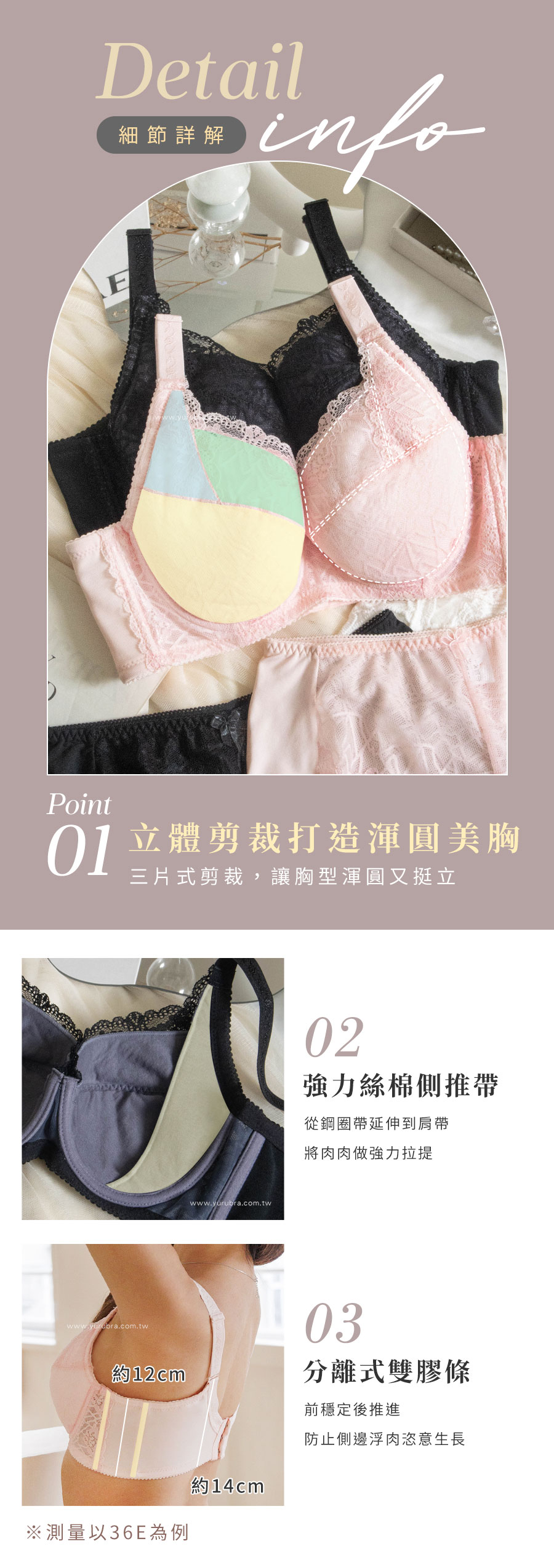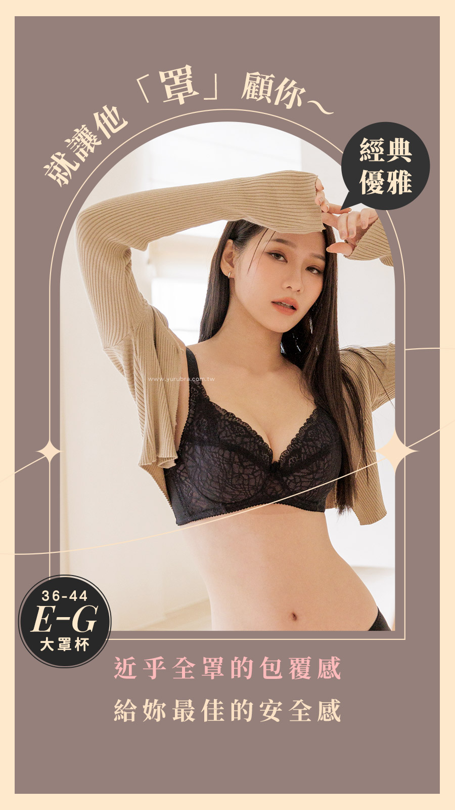 ★大罩杯水水,請讓他「罩」顧妳! ★經典版型與優雅外型,絕對擄獲大胸水水的芳心 ★近乎全罩的包覆感,給妳最佳的安全感 ★U型鋼圈×側推帶,托高、防下垂、防外擴 ★杯模與蕾絲加高做雙重包覆,胸前不易簍空走光 ★蕾絲及杯模皆做三片式剪裁,打造渾圓而挺立的胸型 ★分離式膠條設計,防虛側邊浮肉恣意生長 ★背片內縮U型剪裁,搭配三排三扣,穿著好穩定 ★台灣製造,品質保證